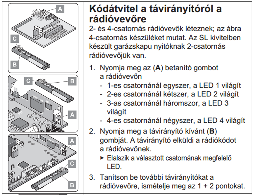 Figyelem! A távirányító feltanítása esetén a kapu működésbe léphet! Az alábbi leírás tájékoztató jellegű. A pontos betanítási útmutatót az automatika gépkönyvében találja! A felprogramozást a leírás átolvasásával kezdje, ellenkező esetben akár az összes távirányítót törölheti a rendszerből. A programozás előtt győződjön meg arról, hogy a kapu útjában és közelében sem személy sem akadály nincs!